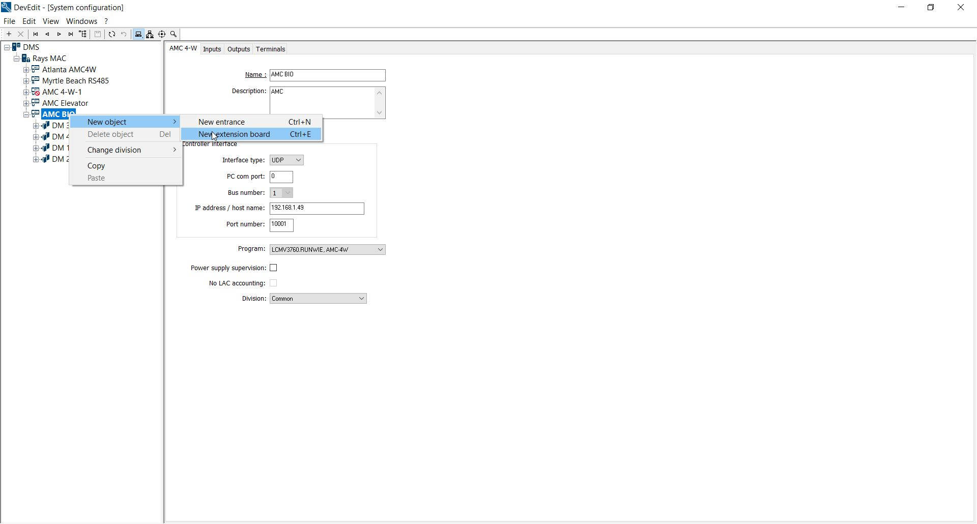 4. Once in the "Device Data" screen, navigate to the AMC controller that the reader extension will be added to. Right click on the controller and select "new object" and "new extension board".