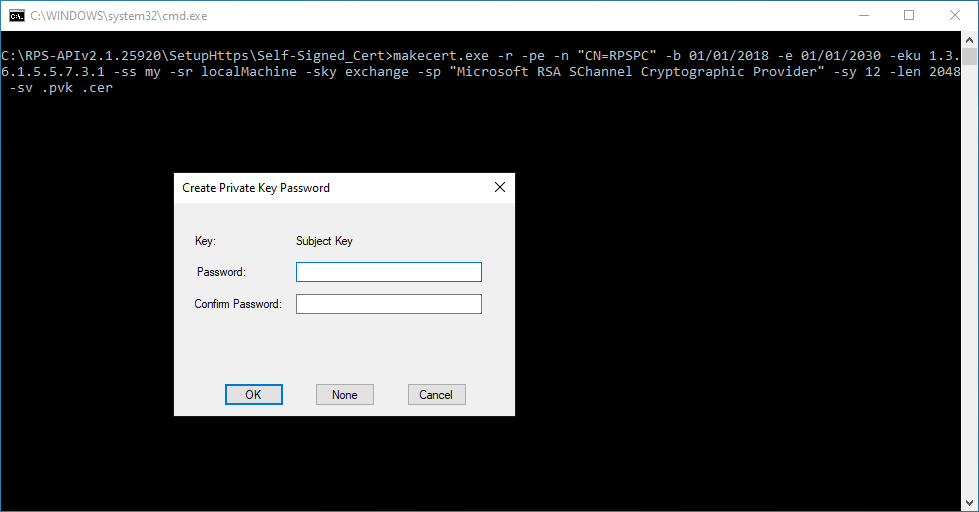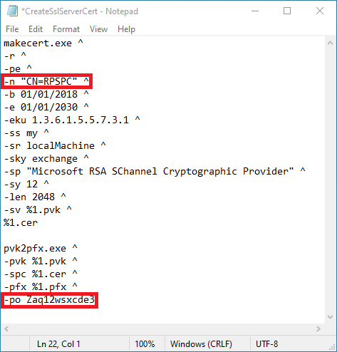 In the –n line, replace “RPSPC” to the computer’s name where the RPS is installed. The –po line is the password assigned to the PFX file created. We recommend to input your own password.