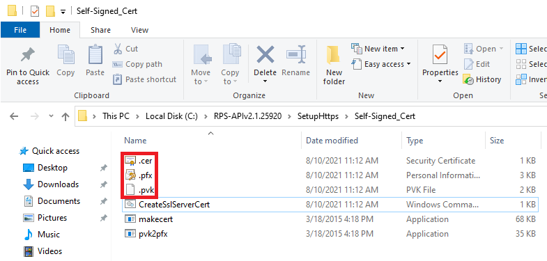 Three files are now created: the certificate, the private key, and the PFX file that contains both files.