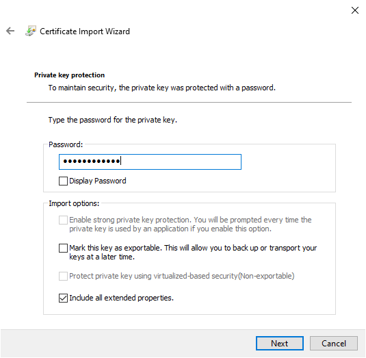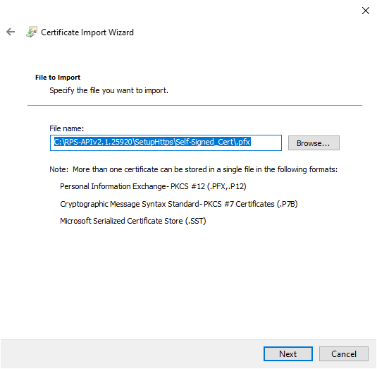 To install the certificate in the RPS computer open the PFX file. In the Certificate Import Wizard, Select Local Machine and click next.