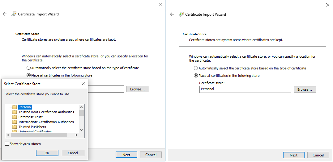 Choose the Certificate store “Personal” and click next