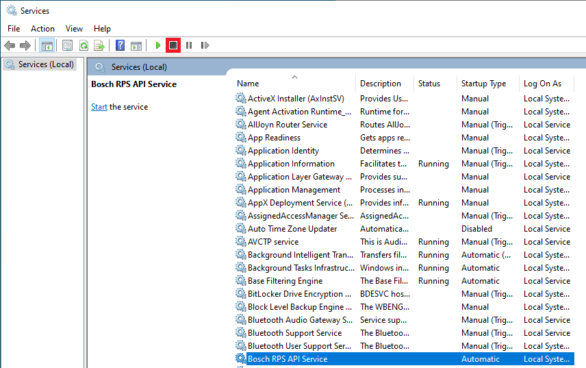 Select Bosch RPS API Service and click the stop button