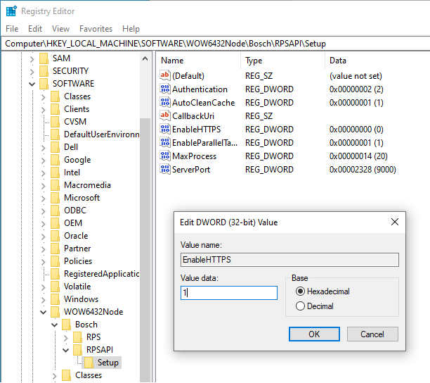Navigate to “HKEY_LOCAL_MACHINE\SOFTWARE\Wow6432Node\Bosch\RPSAPI\Setup”. Modify the value of “EnableHTTPS” from 0 to 1.