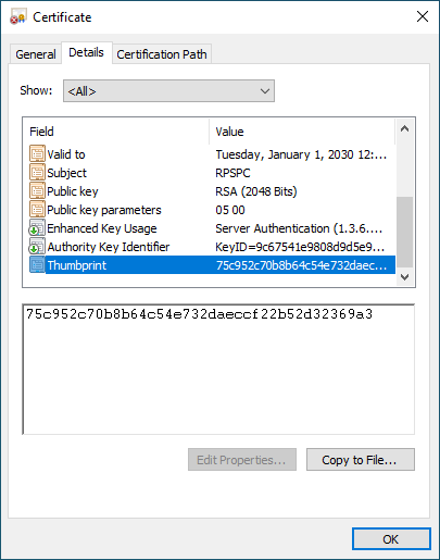 Copy the thumbprint of the certificate used: Open the certificate, go to Details tab and scroll down to Thumbprint.