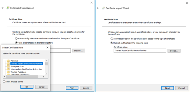 Choose the Certificate store “Trusted Root Certification Authorities” and click next