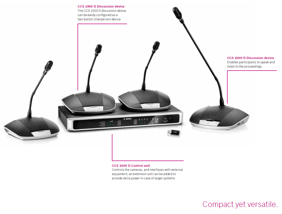 Our CCS 1000 D Digital Discussion System is compact, easy-to-set-up, and easy-to-use. Yet it provides advanced features and exceptional versatility making it the ideal solution for small-to-medium-scale meeting areas.