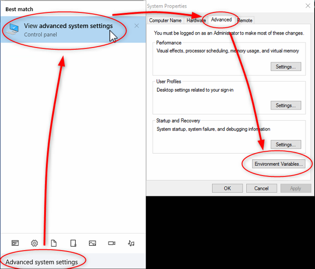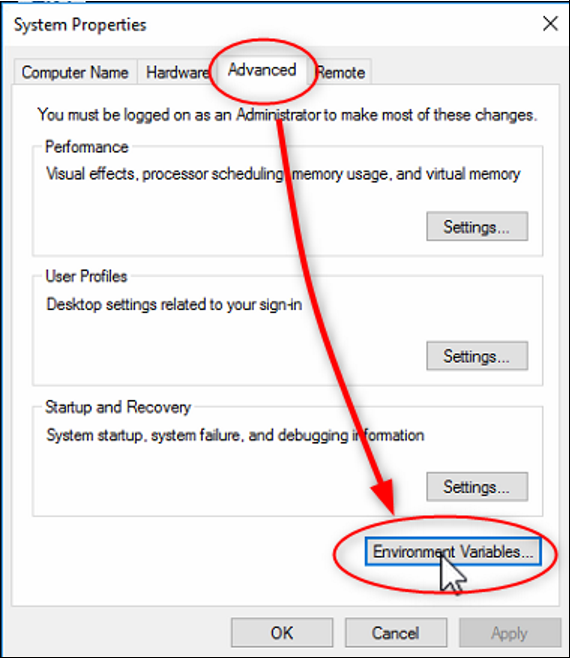 Type in the search column (Windows + S key ) "advanced system settings" than click on "Advanced" and on "Environment Variables".