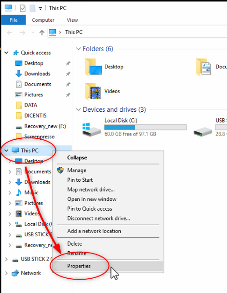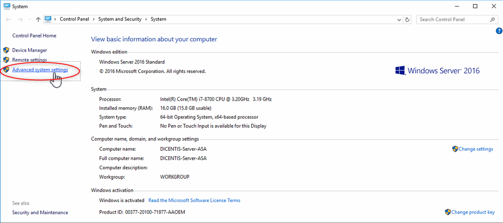 Additional you can open the file explorer (Windows + E Key) and do a right mouse click on "This PC". After that select Properties and open Advanced system settings.
