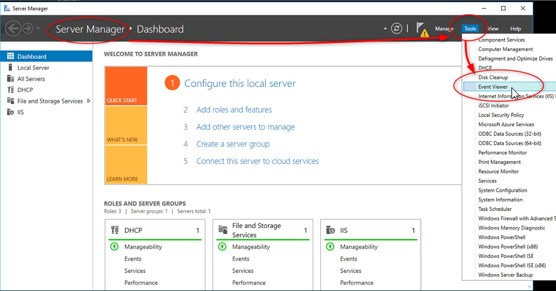 1. First, open the Server Manager > select Tools and open the Event Viewer. It is also possible to use search function to open the Event Viewer.