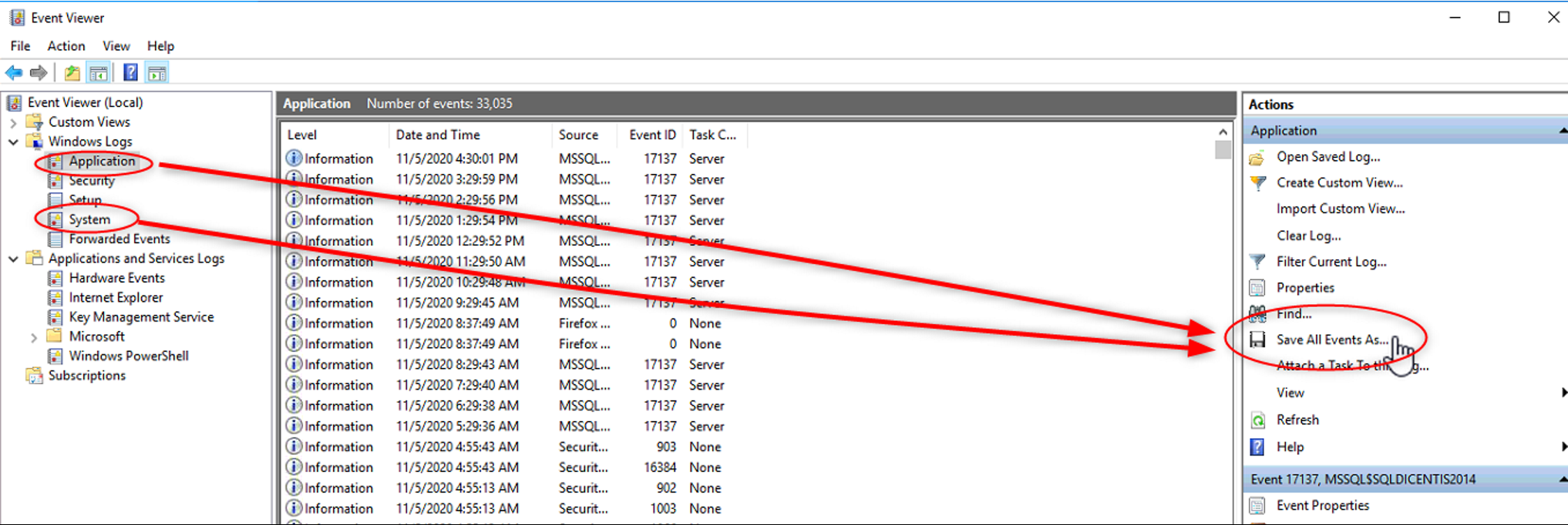 2. Now click on "Windows Logs" and select "Application". You can "Save All Events…" at the right side of the program to any place. Repeat this also with "System". The other logs like Security are normally not needed and only requested by special circumstances from the Technical Support