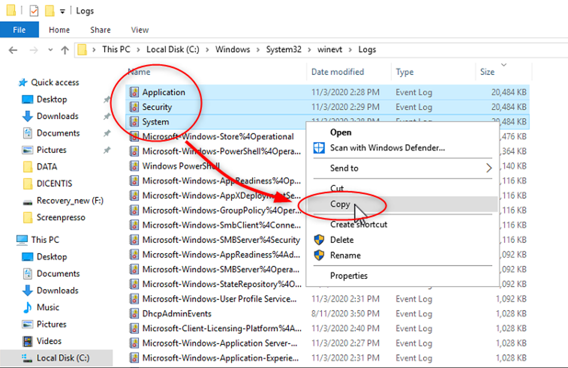 How to extract the Microsoft Windows Server log file (Event Viewer) on DICENTIS Server?