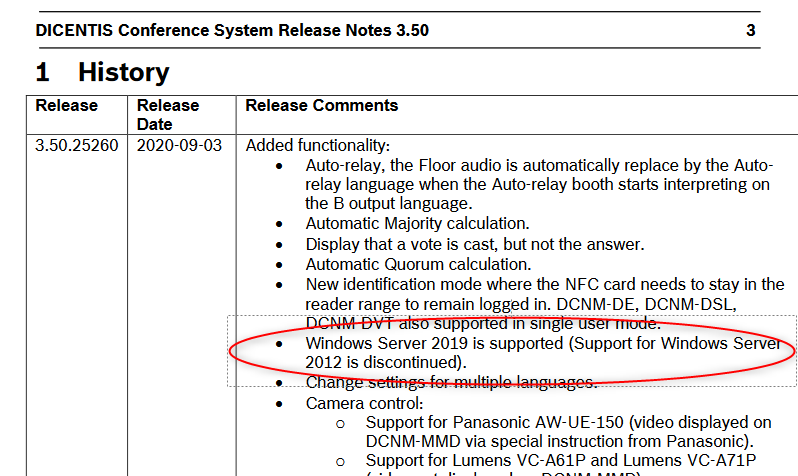 Please note that we had discontinued the service for the Windows Server 2012 R2 for the DICENTIS Conference System software since V3.50. If you would like to use the newest version (added functionality and more software improvements) you should upgrade to Windows Server 2016, 2019 or at best 2022. But the new functionality since 5.00 (Media Gateway) also require faster and more powerful hardware and specially GPU power so we advice to change to a new DCNM-Server3 with Windows Server 2022 as well at some point in time. Also Windows Server 2019 and 2022 are not compatible with older version of the DICENTIS Software like V3.40 or lower and it may cause problems. Please keep in mind that you need a valid SMA (Software Maintenance Agreement) to install newer DICENTIS software.