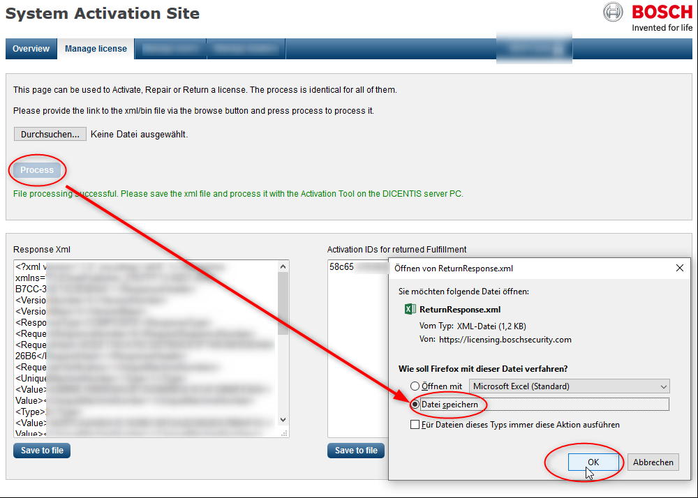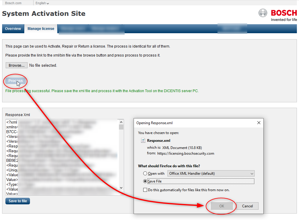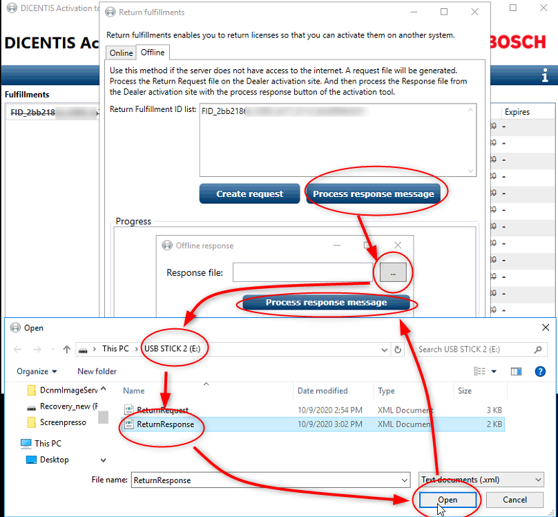 28. Now go to the Dicentis Server and open this "Response.xml" with the "Process response message" button.