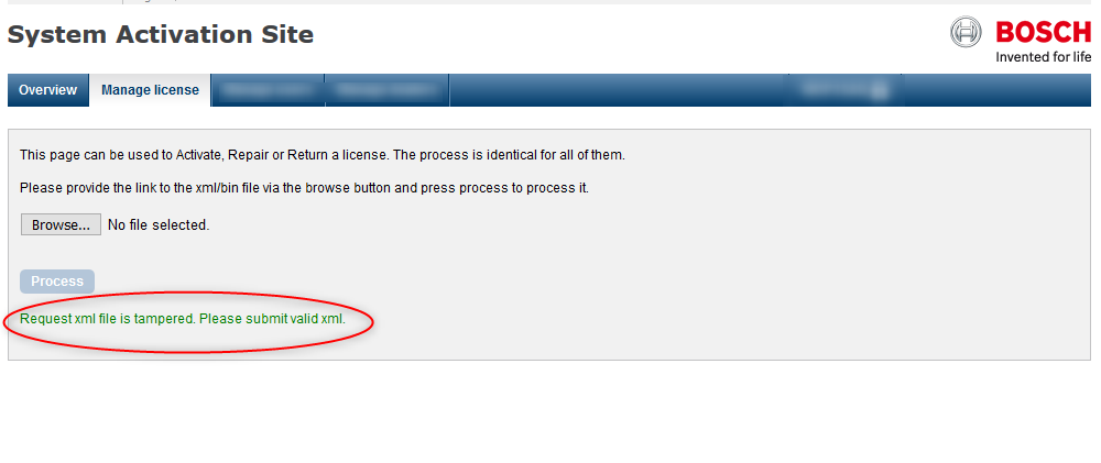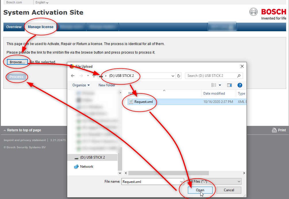 16. Now select " Manage license" than click on "Browse… ,open the "ReturnRequest.xml" file and click on "Process".