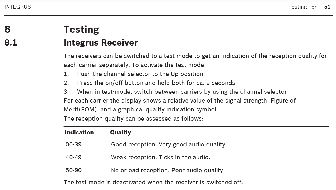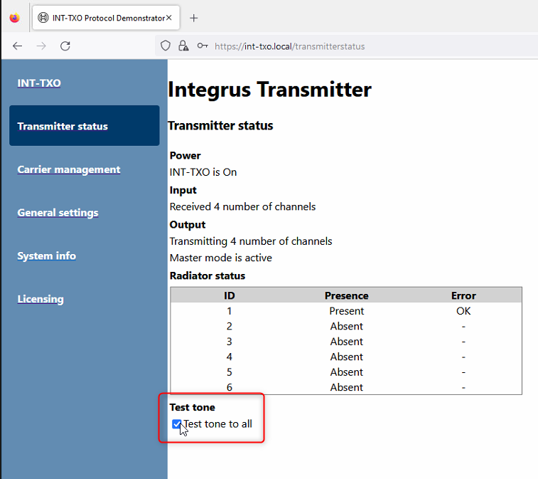 Here you can check the Presence of Radiators and initiate an test tone which can be checked for example on the receivers.