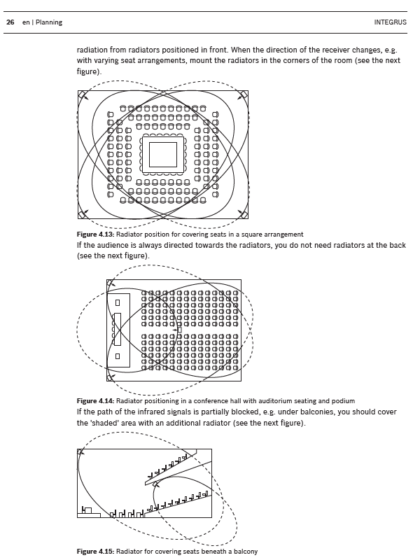 Receivers as well the Radiators have an cover angle and the installation must be planned carefully to avoid interference. Due to the infrared light technologies signal shadows can occur behind objects and direct sight to the Radiators is recommended.