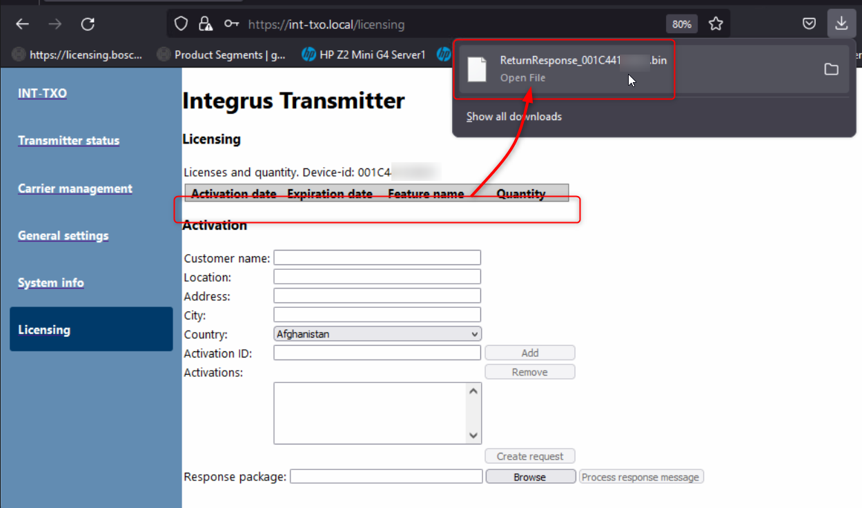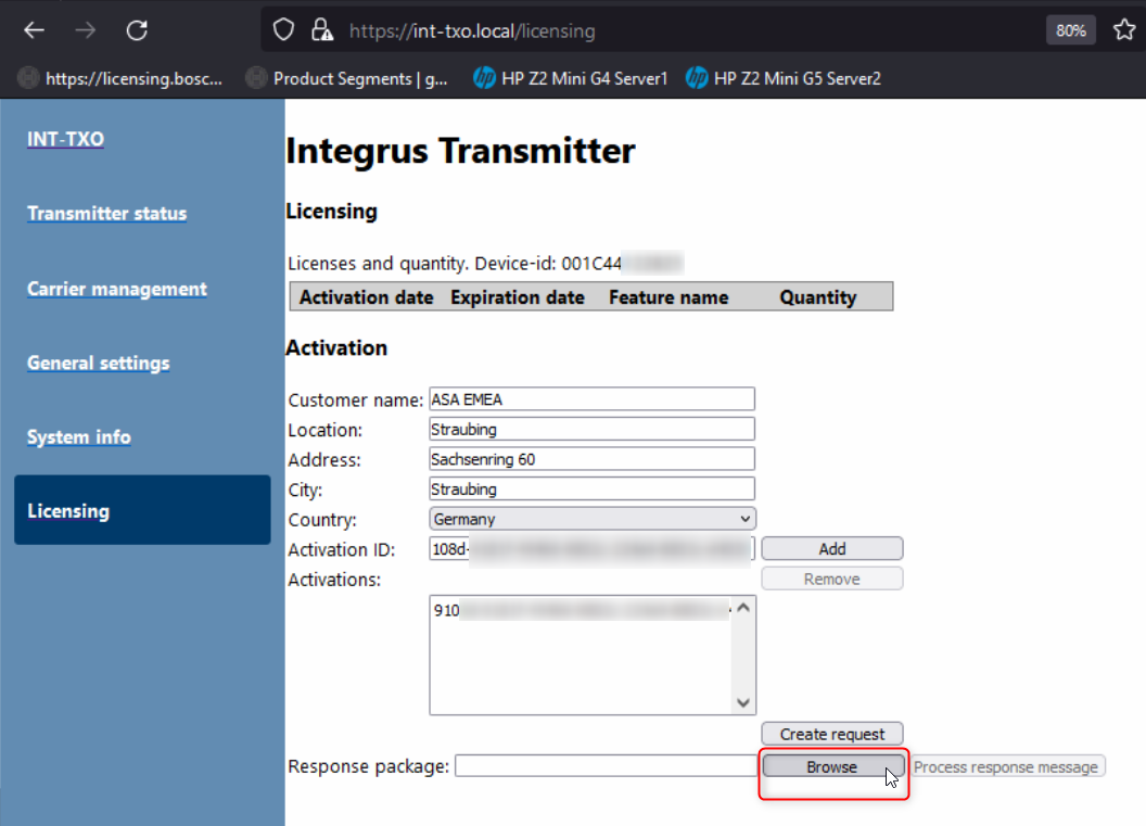 Brows in the TXO Licensing page for the ResponseRequest file which were created via the System Activation Site