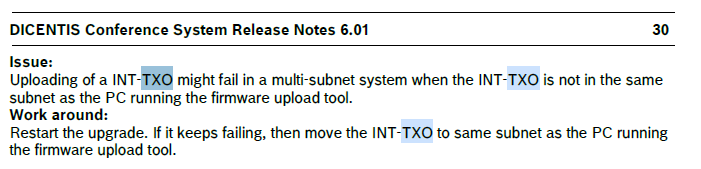 The Minimum DICENTIS Software requirement is 4.20 or else the TXO will not work. The DICENTIS software iso which include the Firmware Upload Tool can be found here.