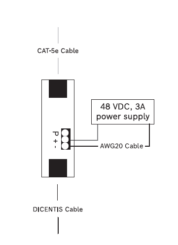 Due to some fire protection or building related requirements it is also possible to separate the power and Ethernet with the couplers. For example use an 2m cable for discussion unit to the first coupler(1) next an CAT-5e cable + separated AWG 20 cable or bigger with 80m through the fire protected wall two the second coupler and form that with an 5 m DICENTIS system cable to the DCMN-PS2.