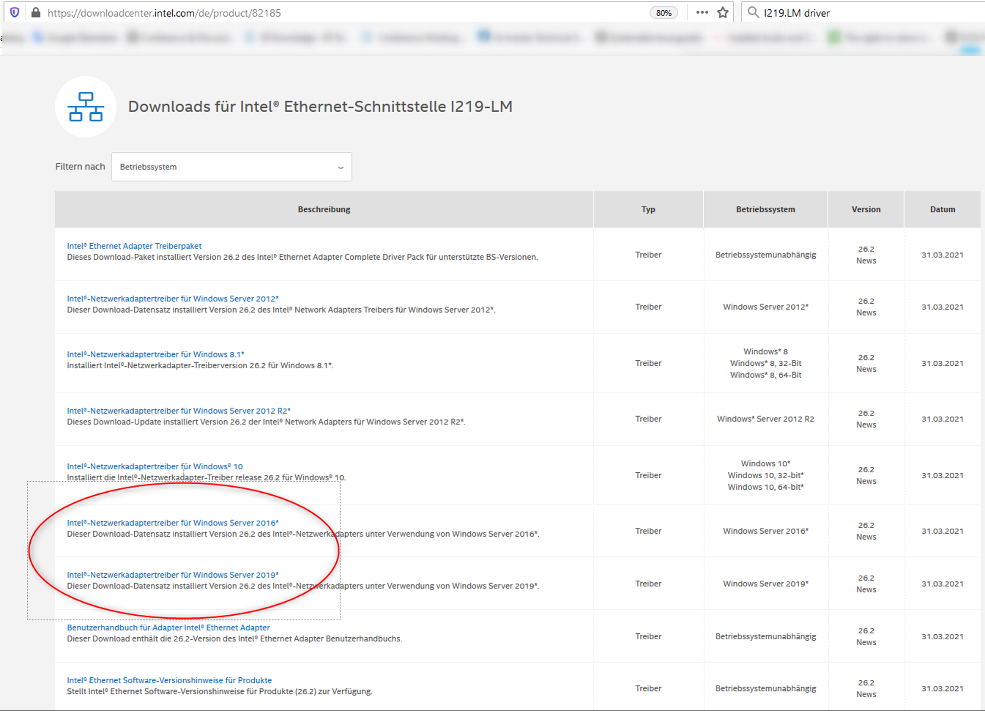 3. To do a manual search go to the home page of for example Intel and search your driver. Please pay attention to choose the right Windows Server 2016 or 2019.
