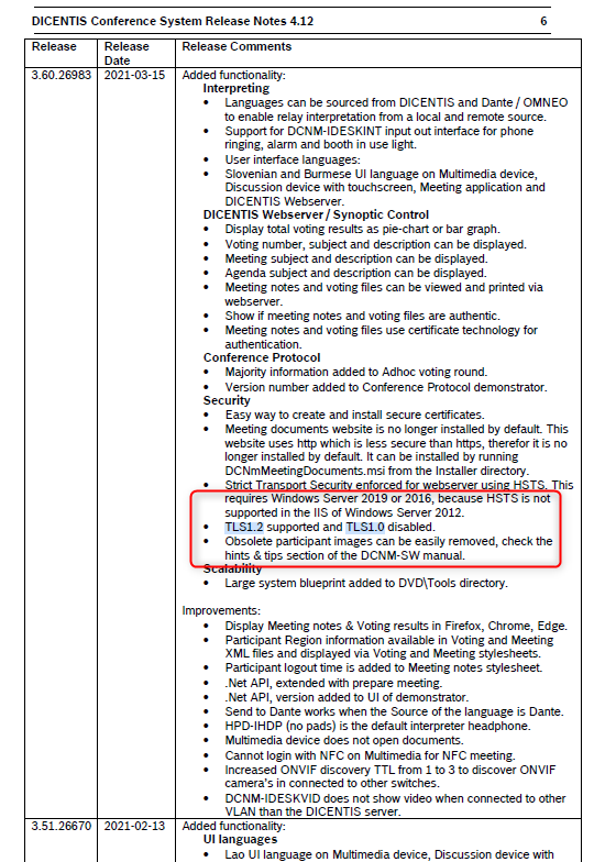 During upgrading the DICENTIS Conference system to 3.60 or higher, the TLS1.0 security encryption will be disabled and replaced with the new TLS1.2. Since the first generation of Multimedia Device (MMD) do not support TLS1.2 instead of MMD2 version, it will not be possible anymore to show an logo or participant images on old hardware MMDs.
