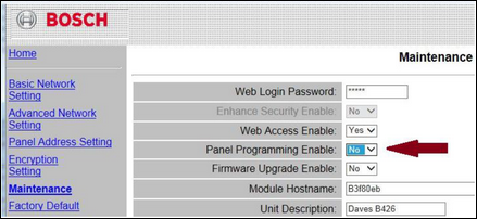 Log into the Web-Browser and select Maintenance. Click on the drop-down arrow beside the field; Panel Programming Enable and change it to Yes.
