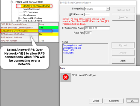 - If the actual alarm panel type and the panel type selected in RPS are a correct match, check the selection for Answer RPS Over Network? When NO is selected, RPS may return the Invalid Panel Type message as described in figure 1.