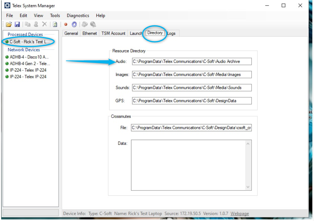 Once the password is no longer default and you are logged into CSoft on TSM, then you go the the DIRECTORY tab. This is where you can change the location of where the audio files are stored. There is not a browse function on this, so you will either need to manually type in the directory location or copy and paste the location in. After you have put in the path to where you want the audio files to be saved to, you will need to write to the device in order to save the change. This time use the newly created password.