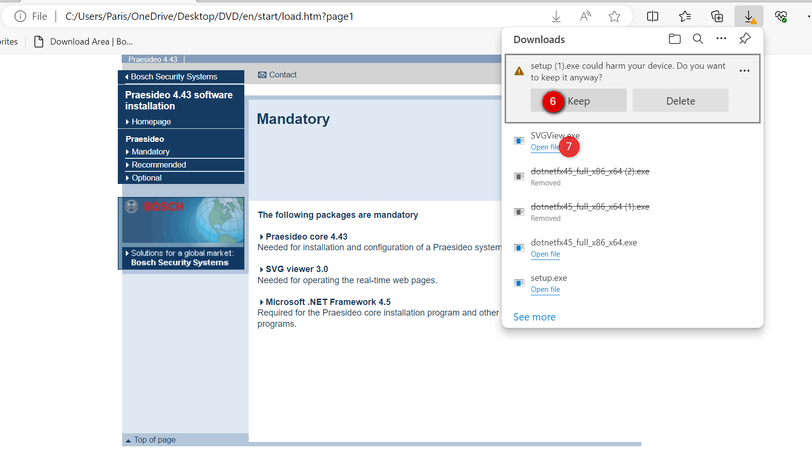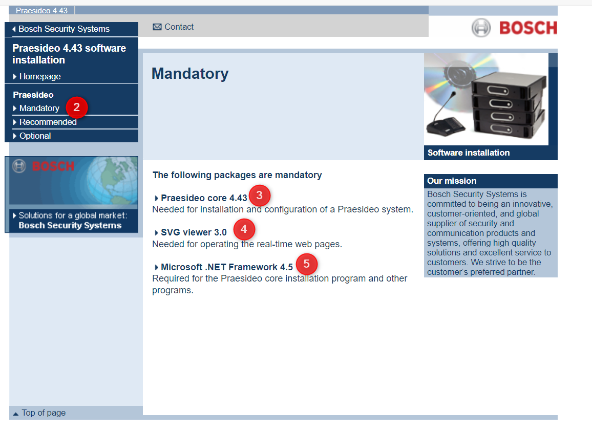 2. Once the program is installed from the “Mandatory” section, download the 3 packages one by one: “Praesideo core 4.43”, “SVG viewer 3.0” and “Microsoft.NET Framework 4.5”