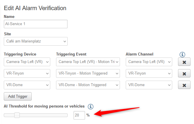 See also Alarm Management Configuration > Service > AI Alarm Verification > AI Threshold for moving persons or vehicles).