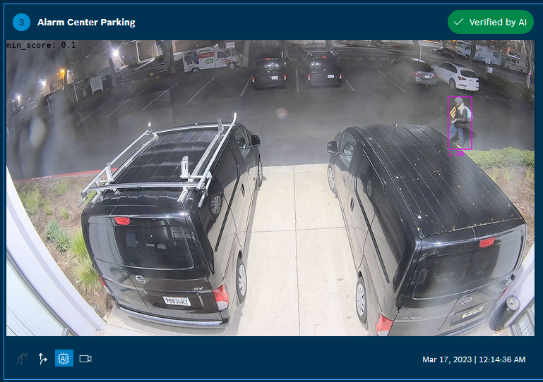 If the AI score is above the configured AI Threshold, the AI alarm gets verified; if the AI score is below the configured AI Threshold, the AI alarm gets rejected.
