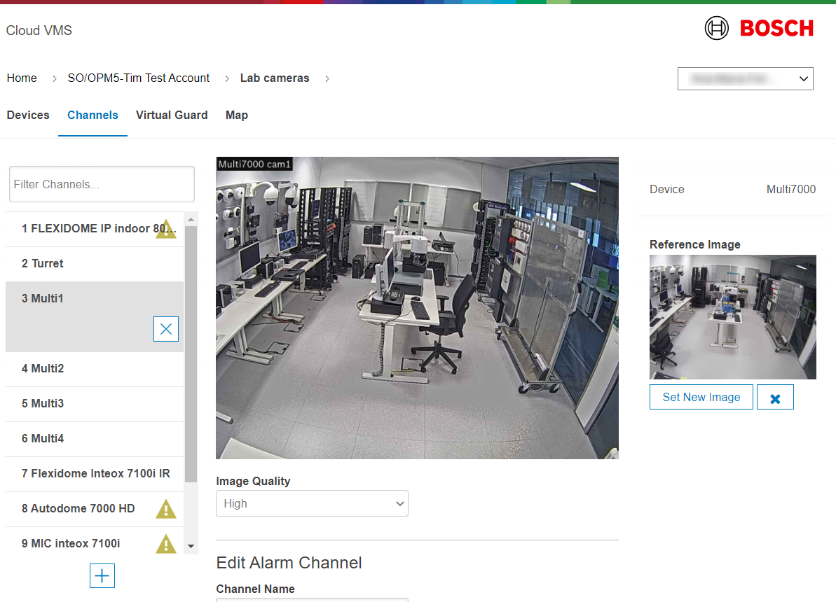 - The Alarm Channel is used as the default video input channel for the alarm agent and uploads the alarm video clip (if available and configured for the camera and the service).