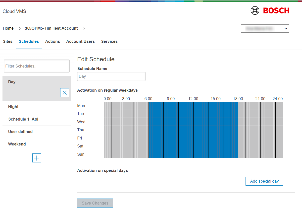 3. Click tab 'Schedules' and modify the standard schedules 'Day', 'Night' and 'Weekend' if needed, or add new schedules.