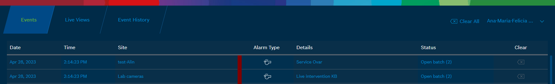 1. Open Alarm Management Event list website (/eventmonitor), log in as Alarm Agent.