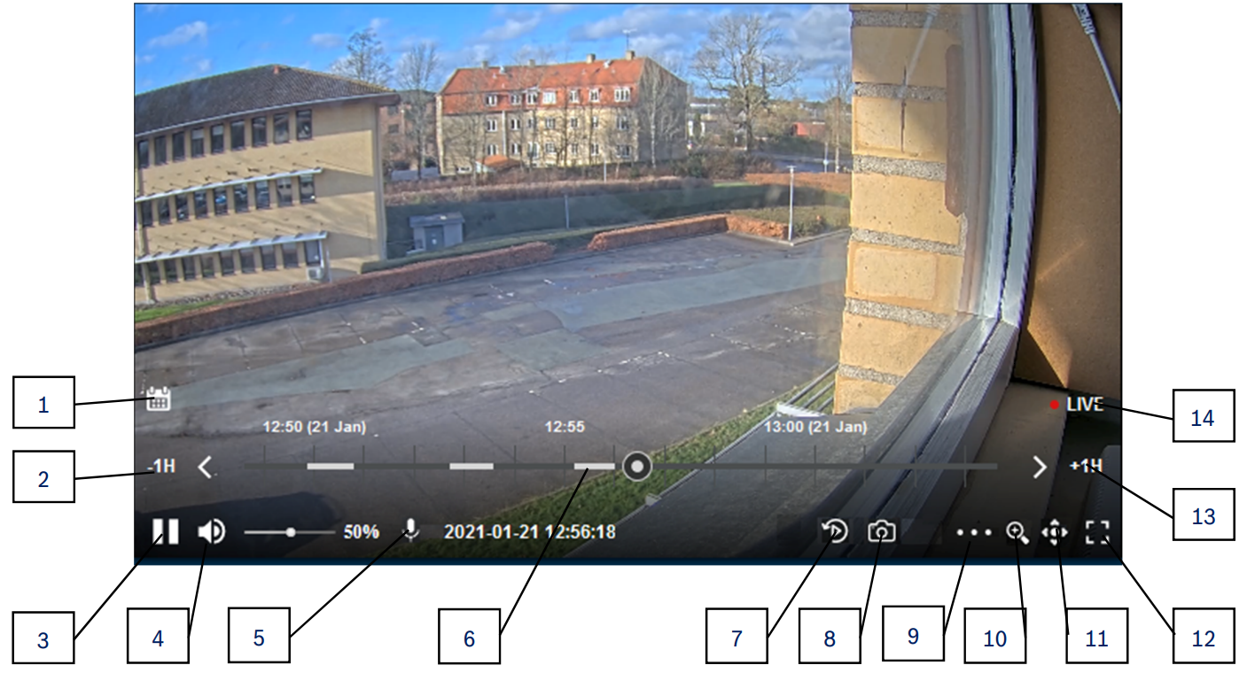 5. For 3rd party cameras, the HTML5 Video Control provides the following functionality for live video and playback in the Live View service: