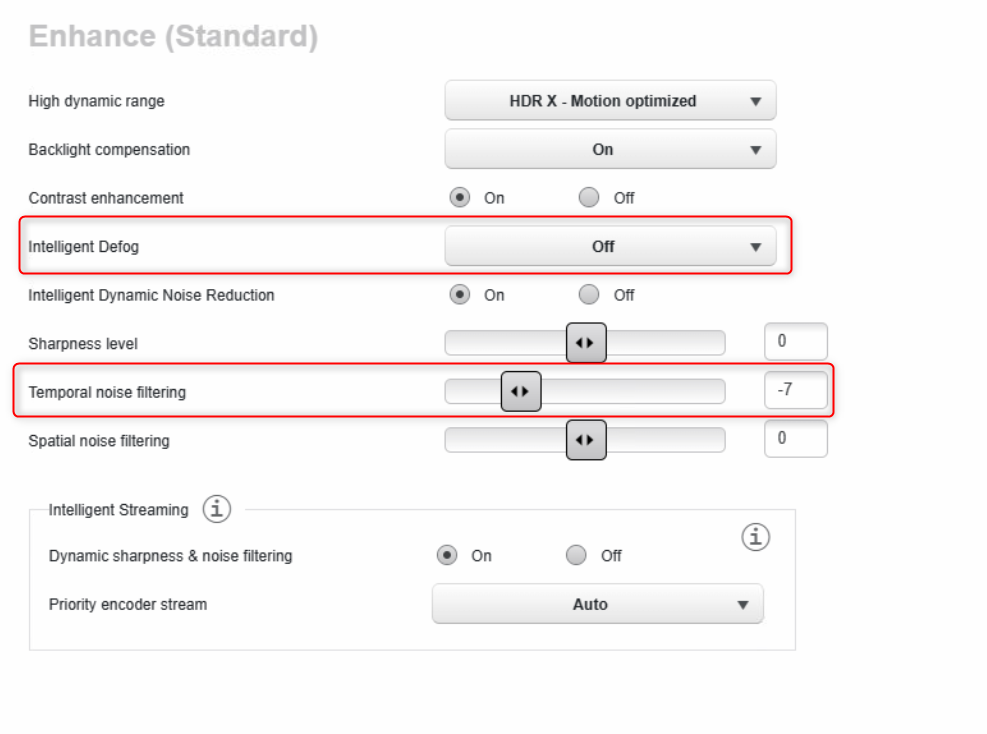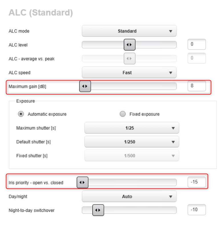 Also, in this FW: an issue with manual iris or focus control via ONVIF was fixed) - Select the Iris priority slider to fully open -15 to have less gain. Important to keep in mind: by using -15, it affects the depth of field.