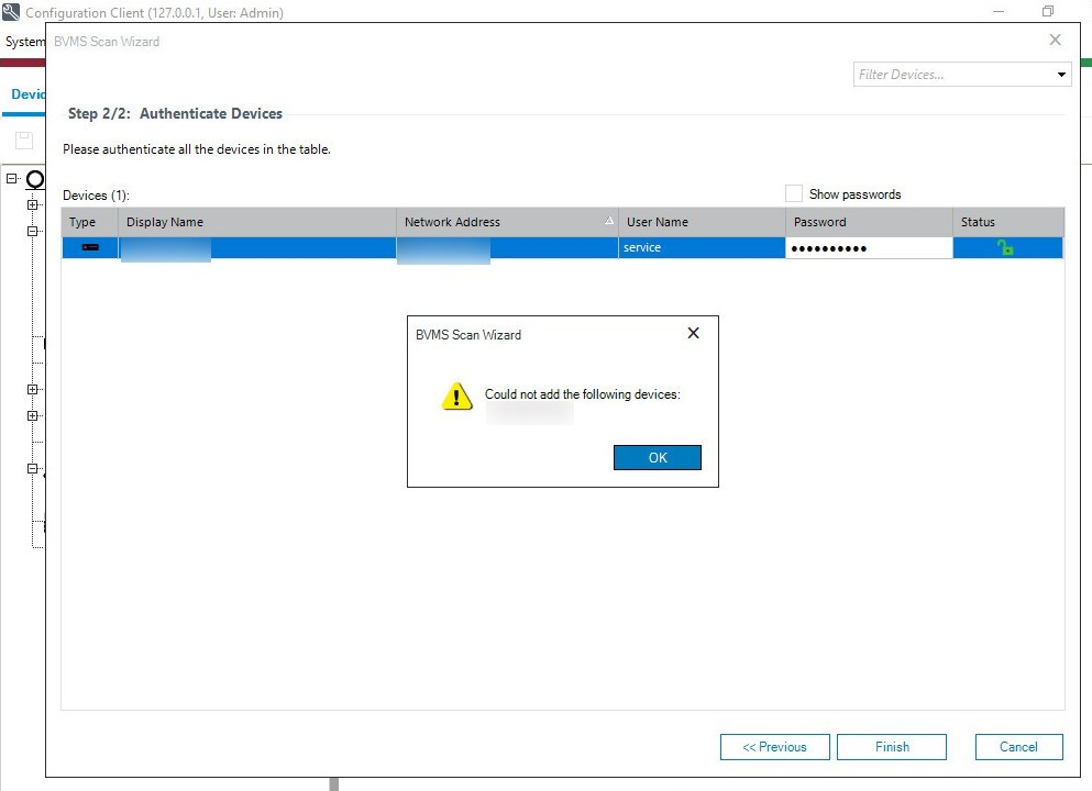When trying to add Bosch IP cameras with FW 7.87 to BVMS version 12.0, via "Scan for Encoders" option, you can see and assign them from the BVMS Scan Wizard list, but after setting their password and click on the Finish button, the following message occurs: "Could not add the following devices: xxx.xxx.xx.xx"