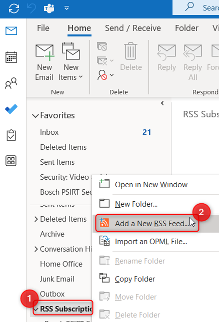 3. Go in Outlook and search for "RSS Subscriptions" option > right click on it > select "Add a New RSS Feed"