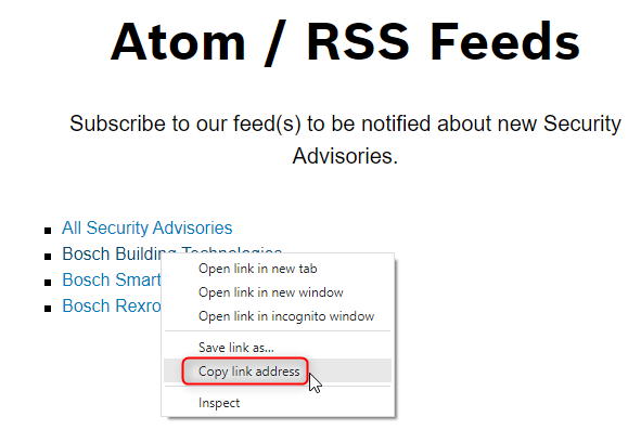 2. Scroll down to the RSS Feeds section on the page > right click on the Security Advisories Category you want to receive notifications for > copy the link address: