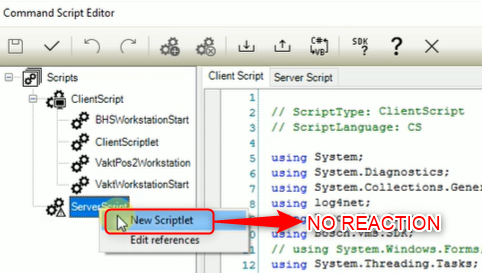 When right clicking on either of them and select the option New Scriptlet from the drop-down menu, nothing happens. No new script can be added.