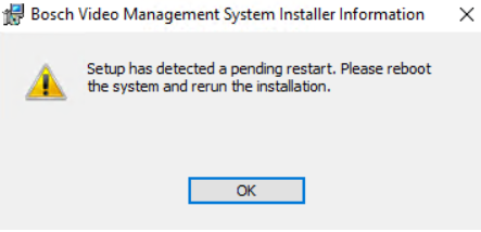 The pop-up dialog window message: "Setup has detected a pending restart. Please reboot the system and rerun the installation" appears when attempting to run the valid BVMS windows installer package.