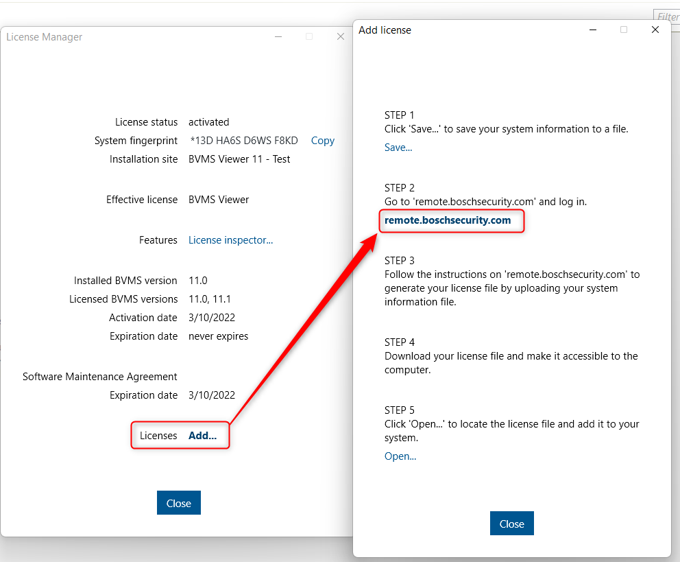 When accessing the BVMS v11.0 License Manage → The link next to the STEP2 (behind the "Add..." from Licenses) attempts to redirect to https://www.remote.boschsecurity.com . This page does not exist and users are not redirected properly to https://remote.boschsecurity.com