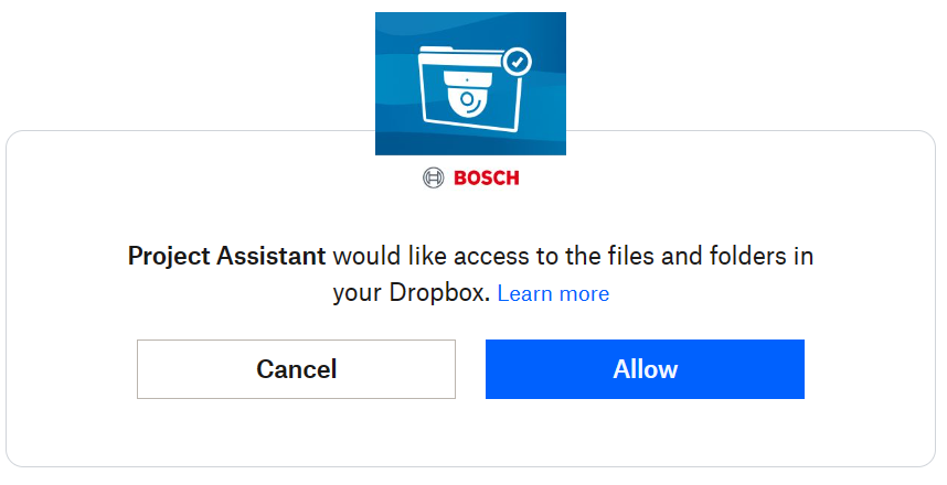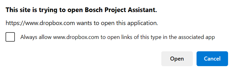 6. Once you are logged in, a pop-up will show up asking you to allow Project Assistant app to access the files and folders from your Dropbox account. Click Allow and Open in the next pop-up displayed:
