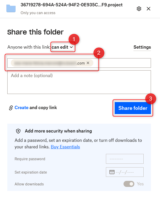 11. Set the access for the associate as editor or viewer only > add the e-mail address of the person you will share the project > click Share folder