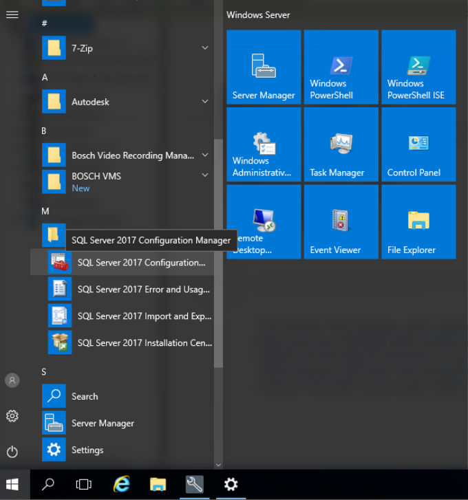 This guide is based on Microsoft Windows Server 2016 (fully updated on 2018-09-28) and Microsoft SQL Server 2017 (version 14.0.2002.14). The SQL Server should be installed in "Mixed mode" authentication (having an "sa" account) and this guide assumes an instance name "BVMS_External".