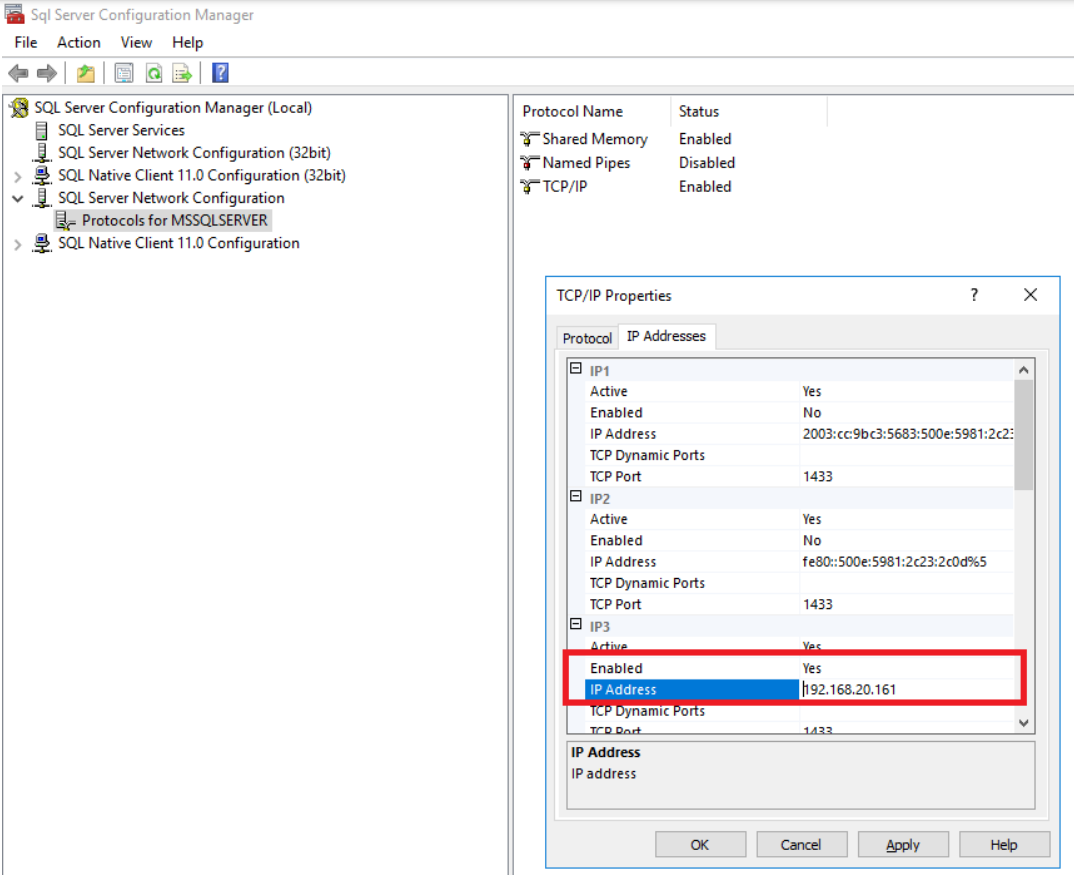 Go to the IP Addresses tab in the properties window, and find the network adapter (search for the correct IP address) which should be used for communication with the BVMS management server. Enable the SQL Service on this adapter by changing the Enabled option to Yes.