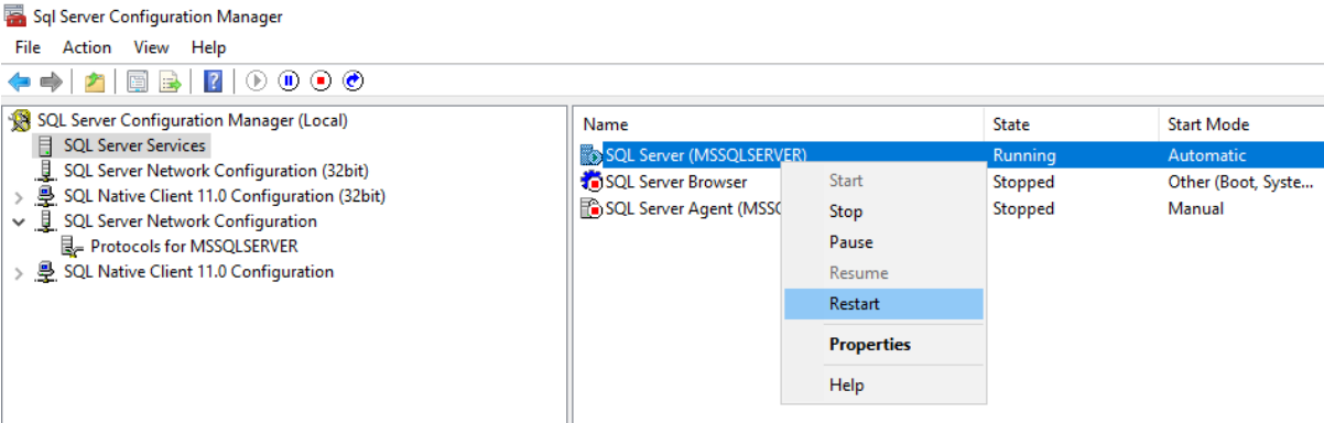 In the first step, the new SQL server is prepared for remote connections. This section assumes the SQL server has just been installed and the configuration is fresh. The instance name used in this guide is "MSSQLSERVER".