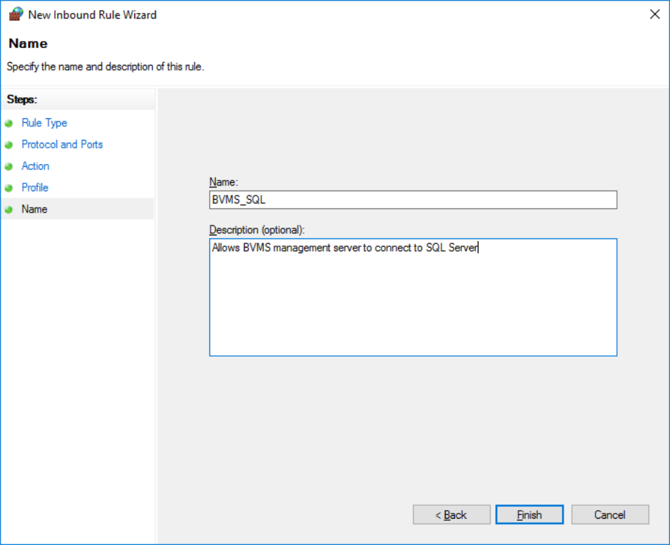 In order to allow the SQL Server to communicate with the BVMS management server, the firewall needs to be adjusted.
