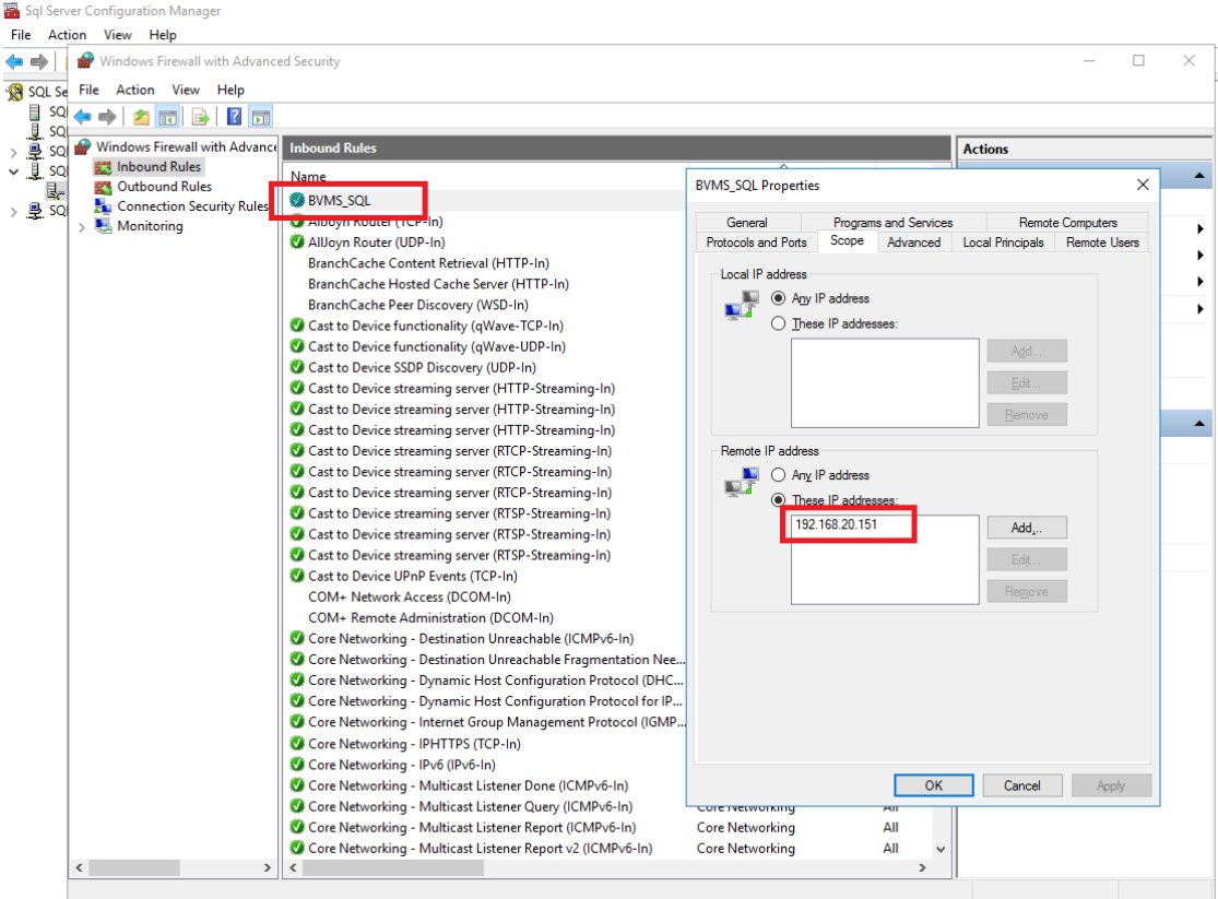 In order to increase the security level, the rule can be adjusted in order to only allow communication between the SQL Server and the BVMS Management server. Open the properties dialogue of the firewall rule, go to the Scope tab, and add the remote IP address of the BVMS Management server (the example below shows 192.168.20.151 as the BVMS Management server IP address.