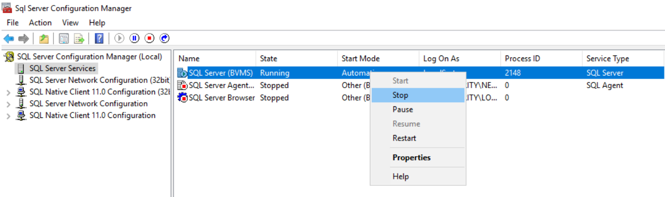 Open the SQL Server Configuration Manager on the BVMS Management server and Stop the SQL Server (BVMS) process.